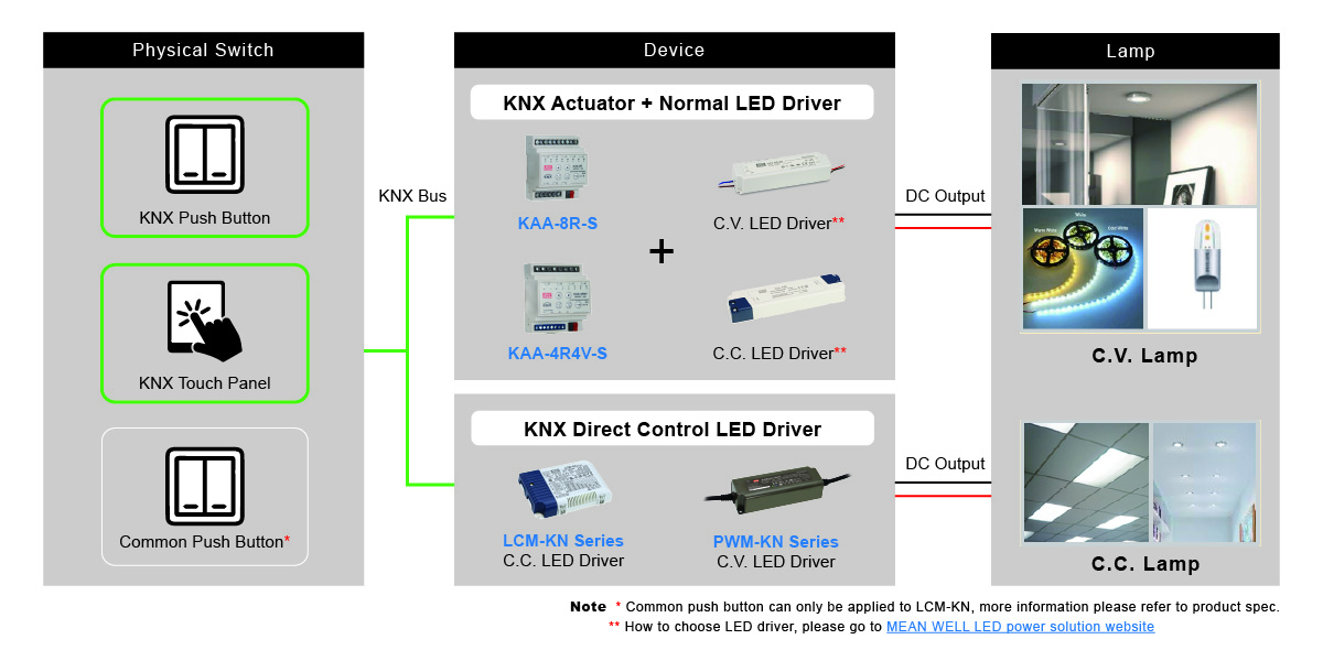 For a more specifics example, users can choose a KNX switch, matched with a KNX actuator, connect to a Constant Voltage (C.V.) LED driver, and switching control Constant Voltage (C.V.) driven lamps.