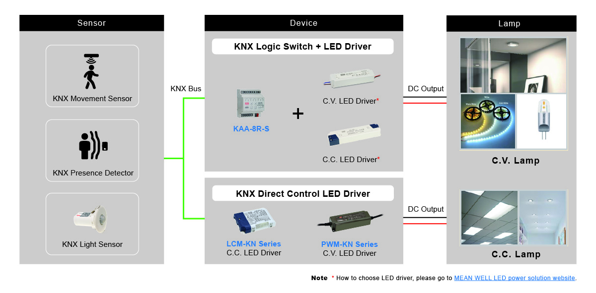 For instance, users can choose a KNX presence detector matched with a KNX actuator, connect to a Constant Voltage (C.V.) LED driver to automatically control a Constant Voltage (C.V.) driven panel light.
