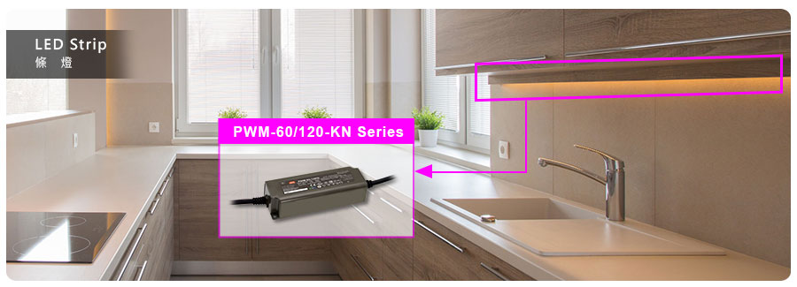 PWM-KN operates from 90~305VAC and offers 12V& 24V output models. Thanks to the high efficiency of up to 90%, with the fanless design, the entire series is able to operate for -40°C~90°C case temperature under free air convection. The minimal dimming level low to 0.5% is suitable for low light level applications e.g. cinema. The output frequency is changeable up to 4KHz to complaint IEEE 1789-2015 no risk requirement providing a great solution for health concern due to light flickering.