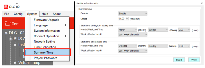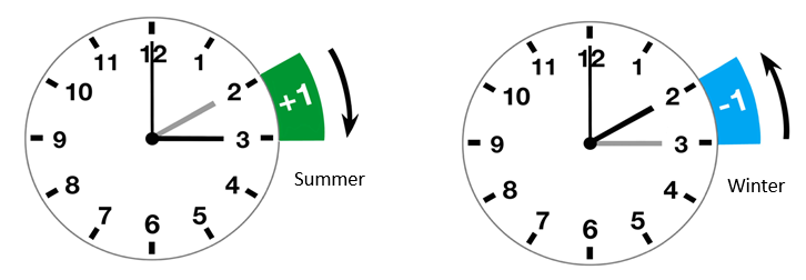 Daylight Saving Time (DST) is the practice of advancing clocks (typically by one hour) during warmer months in United States, Canada, and Australia, and European Union. The typical implementation of DST is to set clocks forward by one hour in spring ("spring forward"), and to set clocks back by one hour in the fall ("fall back") to return to standard time. The "DLC software" allows users to adjust the start and offset of summer and winter time.