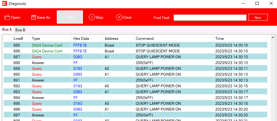 "DLC software" has a built-in DALI bus communication diagnosis function. When user encounters a problem during on-site debugging, he can perform diagnostic analysis, read the communication data between DLC-02 and DALI equipment, and can also download the data report and forward it to the relevant technicians of MEAN WELL so that MEAN WELL technicians can assist users remotely.
