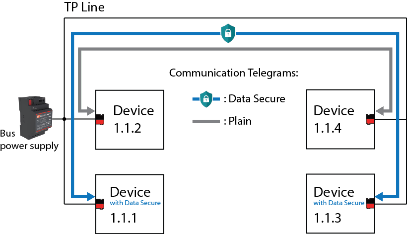 The system components including coupler and (USB) interface must support Extended because the longer telegram format used by KNX Data Secure. This must always be considered when communicating between lines and especially when existing KNX installations are extended with KNX Data Secure. It may be necessary to replace older system components with components compatible with KNX Data Secure.