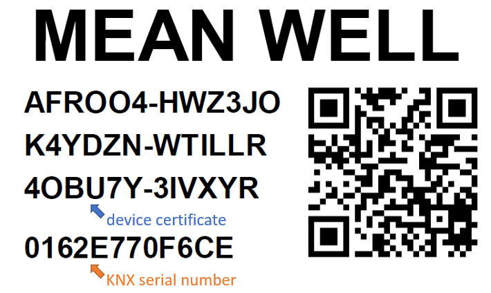 The QR code contains the device certificate in machine-readable form and can be read into a ETS project via a webcam without typing-in.