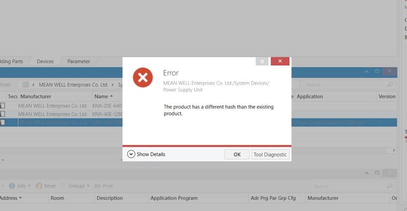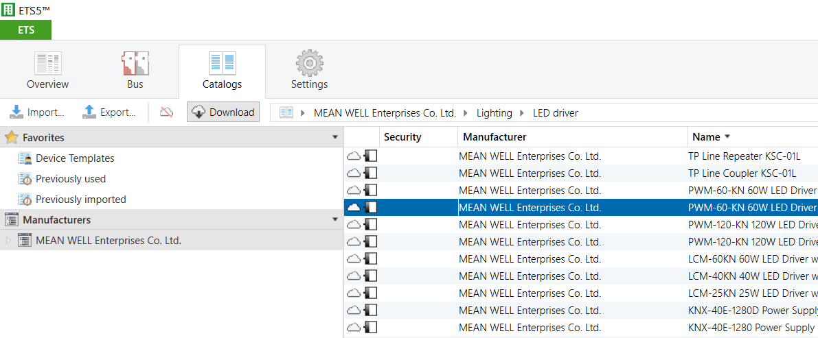 Import of KNX application database of product hardware into Catalogs. The easiest way is the download it via the Cloud( with cloud symbol) or download from MEAN WELL website.