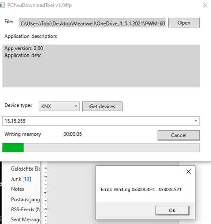 If an abnormal message similar to the following appears when updating the KNX product firmware, it may